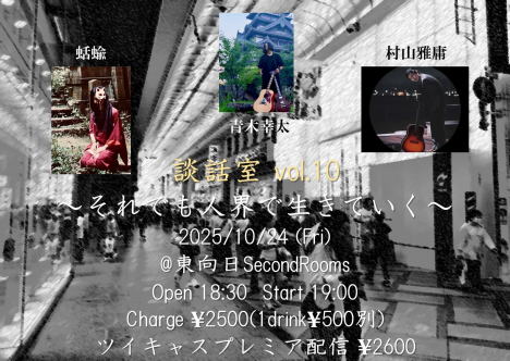 | OPEN/START CHARGE | 18:30 / 19:00 ¥3,000(1drink込) ●ツイキャスチケット¥2,600  配信チケット購入先→https://premier.twitcasting.tv/c:secondrooms/shopcart/391377 | ||