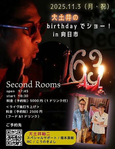 | OPEN/START CHARGE | 17:30 / 18:00 ¥2,500(1drink込) ●ツイキャスチケット¥2,100  配信チケット購入先→https://premier.twitcasting.tv/c:secondrooms/shopcart/395631 | ||